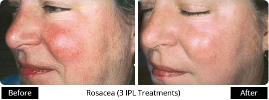 Photo Rejuvenation is a dynamic non-invasive procedure using intense pulsed light (IPL) to rejuvenate the skin. A cold gel is applied to the area to be treated. The smooth glass surface of the IPL hand piece is gently placed on your skin and pulses of light are applied. A slight sting, like the snapping of a small rubber band will be felt. Treatment is administered in a series of procedures that provides excellent long-term results and high client satisfaction. This procedure can be used to treat sun damaged skin (pigmentation & sun spots), Rosacea, vascular lesions, and broken veins & capillaries. Depending on your skin condition(s), a series of five or six treatments may be recommended for effective results.